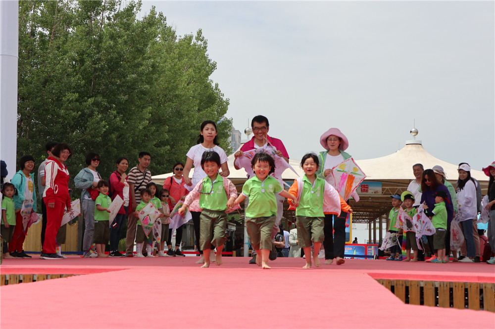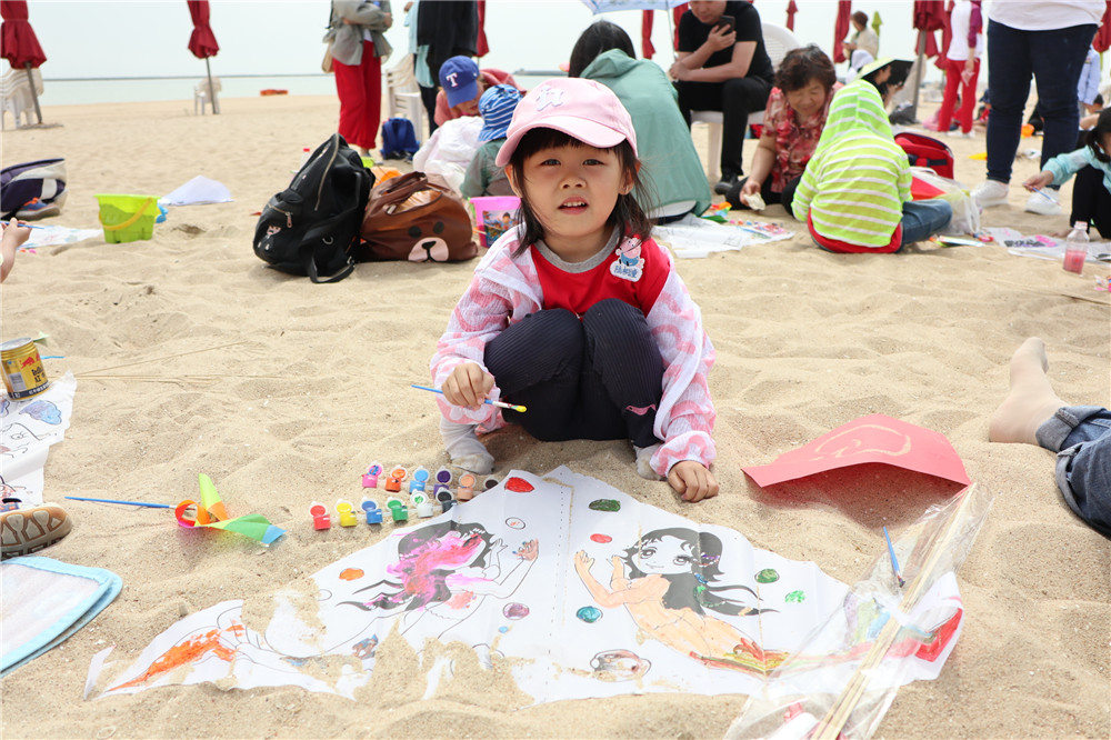 孩子们兴奋地举起画好的风筝,有的拉着线在沙滩上向前奔跑,托风筝的在后紧随。在欢呼叫喊声中,一只只美丽的风筝纷纷飞上了蔚蓝的天空;有的拿着自己亲手绘制的彩色风筝,自信地走上T台,迈着优雅的台步,展示着自己的成绩,与大家一同分享着溢满心田的幸福。