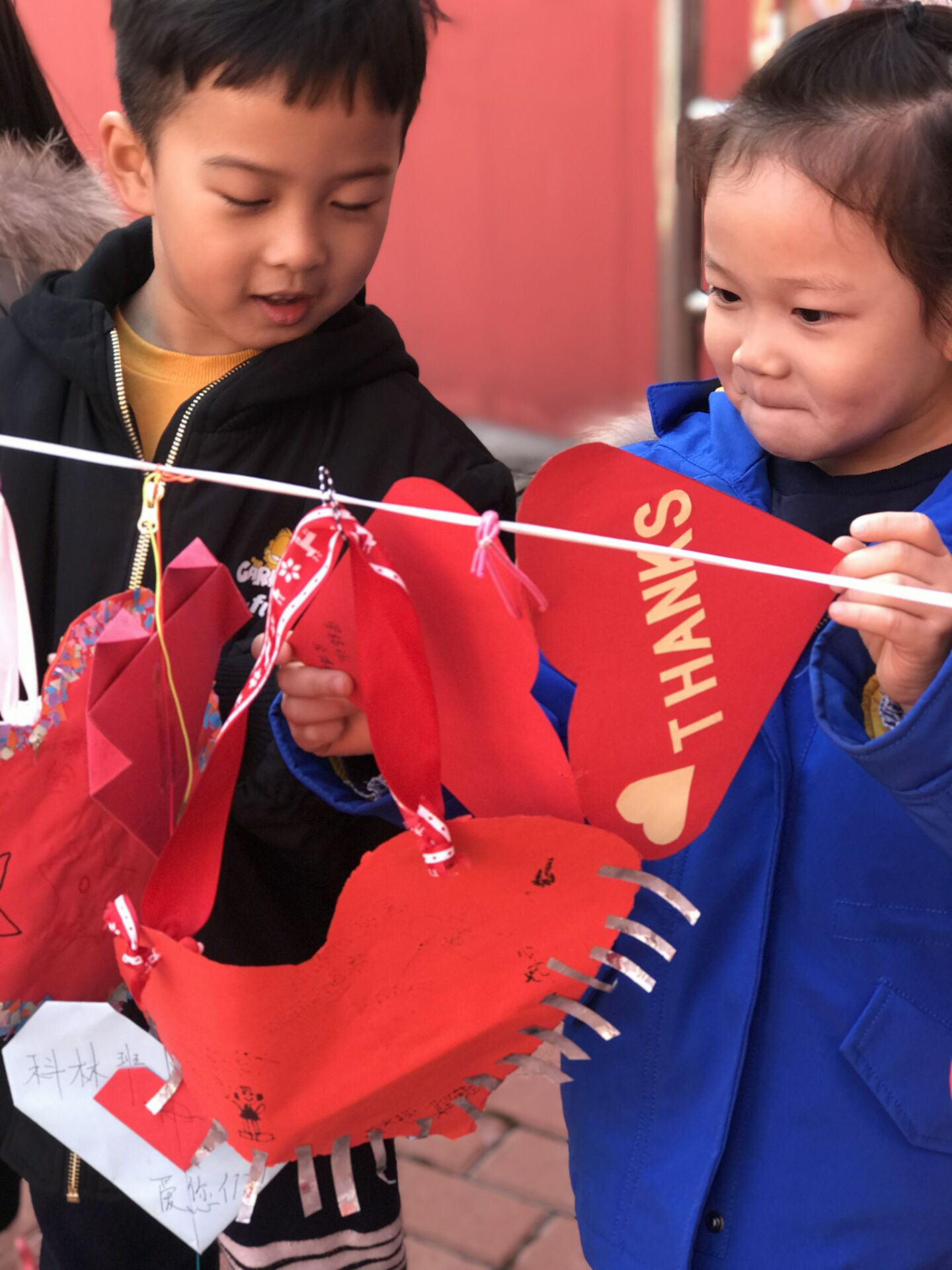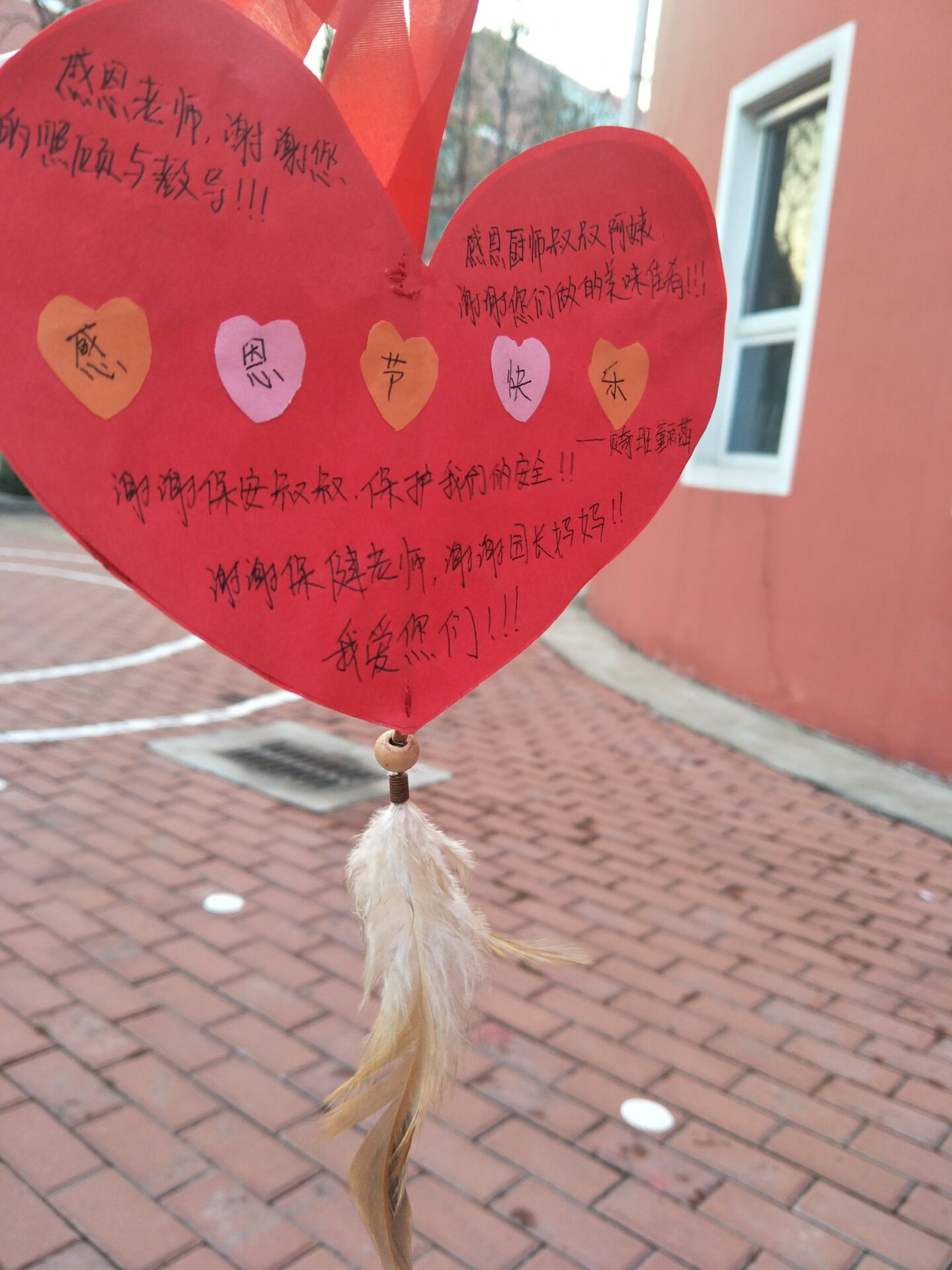 清晨的布朗幼儿园热闹非凡,爸爸妈妈们早早地就带着宝贝们来到幼儿园,他们要将自己亲手制作的感恩祝福卡系在幼儿园门前的祈福绳上!在这个特殊的日子里,他们要把对园长妈妈的爱、对保安叔叔的爱、对厨房叔叔阿姨的爱、对老师们的爱通过这种方式表达出来。