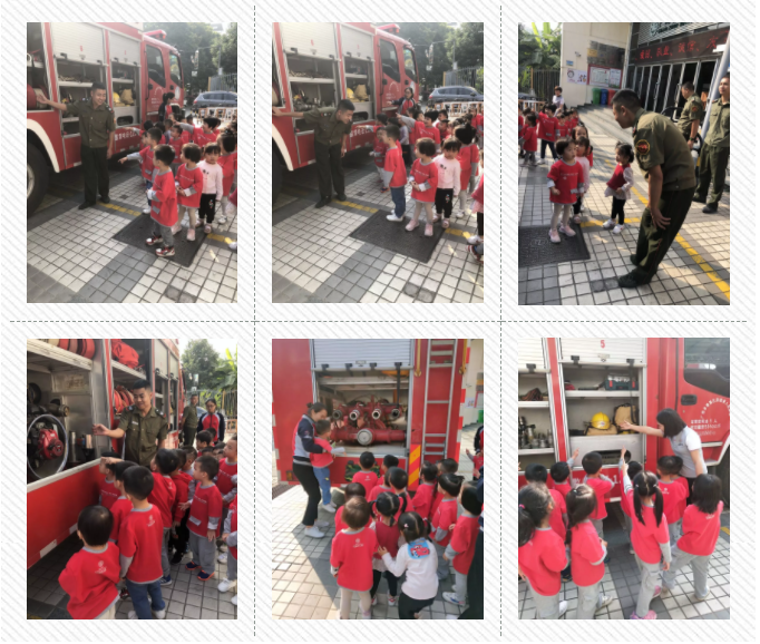 最后,孩子们又被校门外的消防车所吸引,不仅认真的观察消防车内的物品,还时不时向老师提出疑虑,这是什么呢?它是干什么用的呢?老师,为什么会有这些呢?总之,就化身为好奇宝宝。