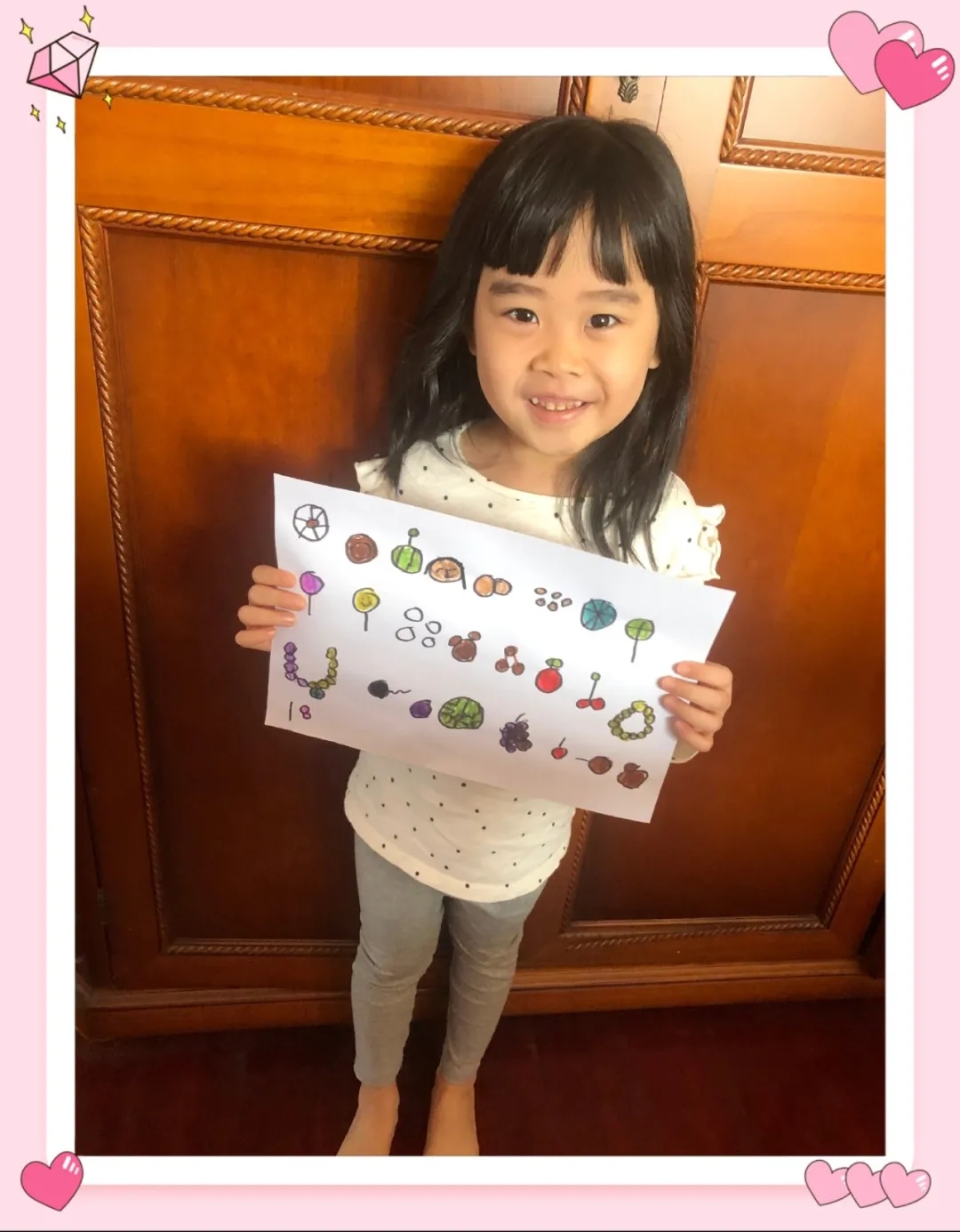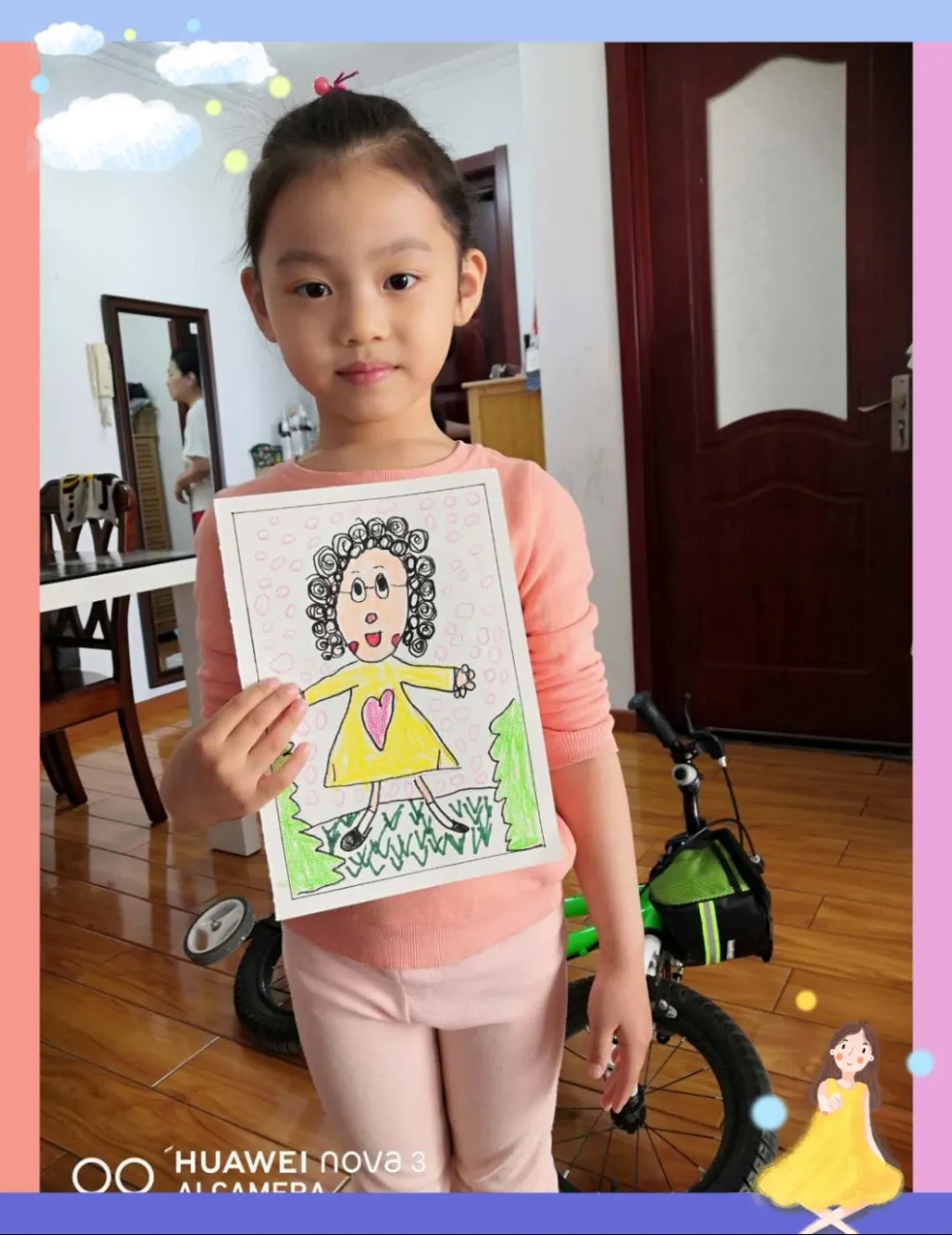 我画的是我的姥姥,姥姥的烫发是我用圆形画出来的,眼睛和鼻子也是圆形,我的背景也是用粉色圆来装饰的。