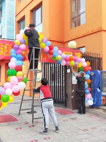 为迎接宝贝们回幼儿园老师们制作了彩虹门,保安爷爷和奶奶早早来到幼儿园装扮好让宝贝们来到童话般的世界。