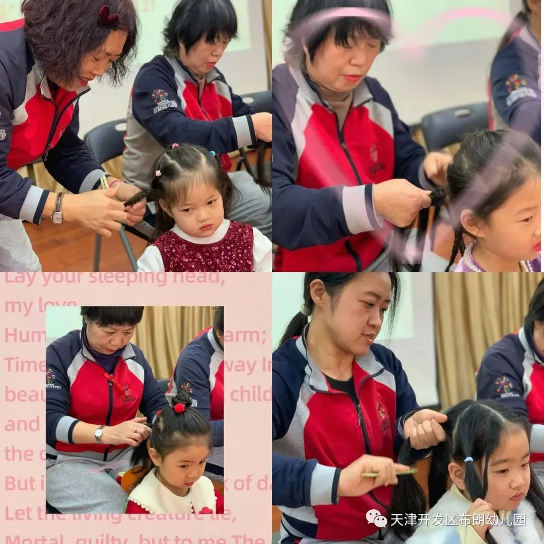 幼儿园保育工作是润物无声的爱,流动于幼儿的一日生活,而扎辫子是其中必不可少的一个环节。新的一年,我们的实操活动又开拓了一个新的领域,开展了《巧手如花,爱满心头》为主题的保育员创意编辫技能竞赛活动。保健医杜燕卫老师担任主持人,保健医杜燕卫老师为大家讲解活动流程和评分标准和宣读比赛规则。比赛现场气氛活跃、秩序井然,评委老师由行政团队组成,评委老师秉着公平公正的原则为大家的作品打分。保育老师们都做了精心的准备,各式发夹、装饰物应有尽有。老师们经常用模具进行练习,灵巧的双手一上手就或团、或勾、或绕、或编,⿇利地将松散的头发打理成各种发型。花苞头、鱼骨头、麻花辫、蝎子辫,女孩们立刻焕发了可爱的神采,为本次活动做好了充分的铺垫。此次活动与其说是⽐赛,其实更是分享,分享创意、分享技能、分享快乐....